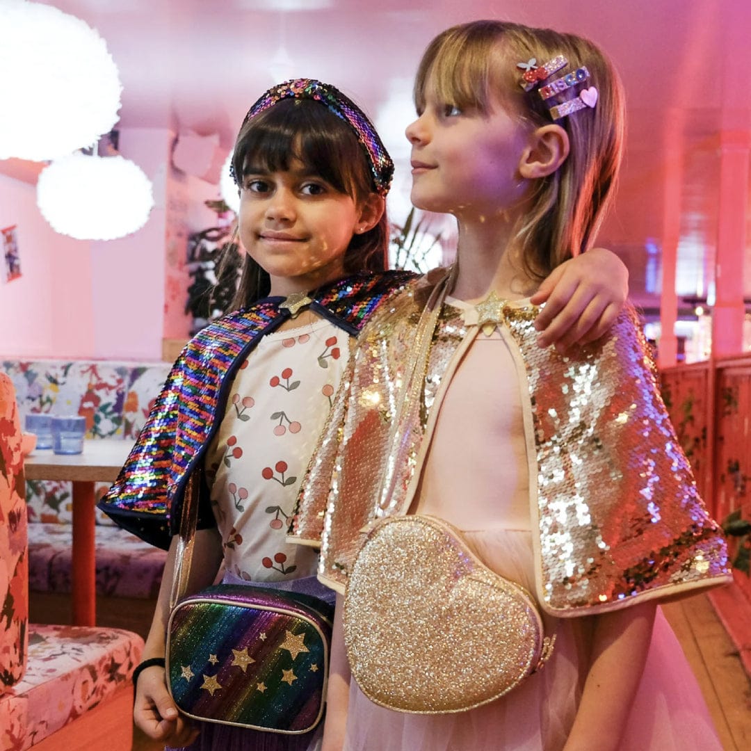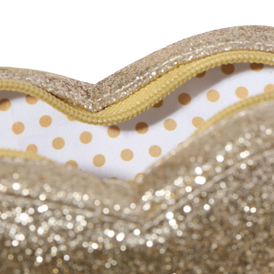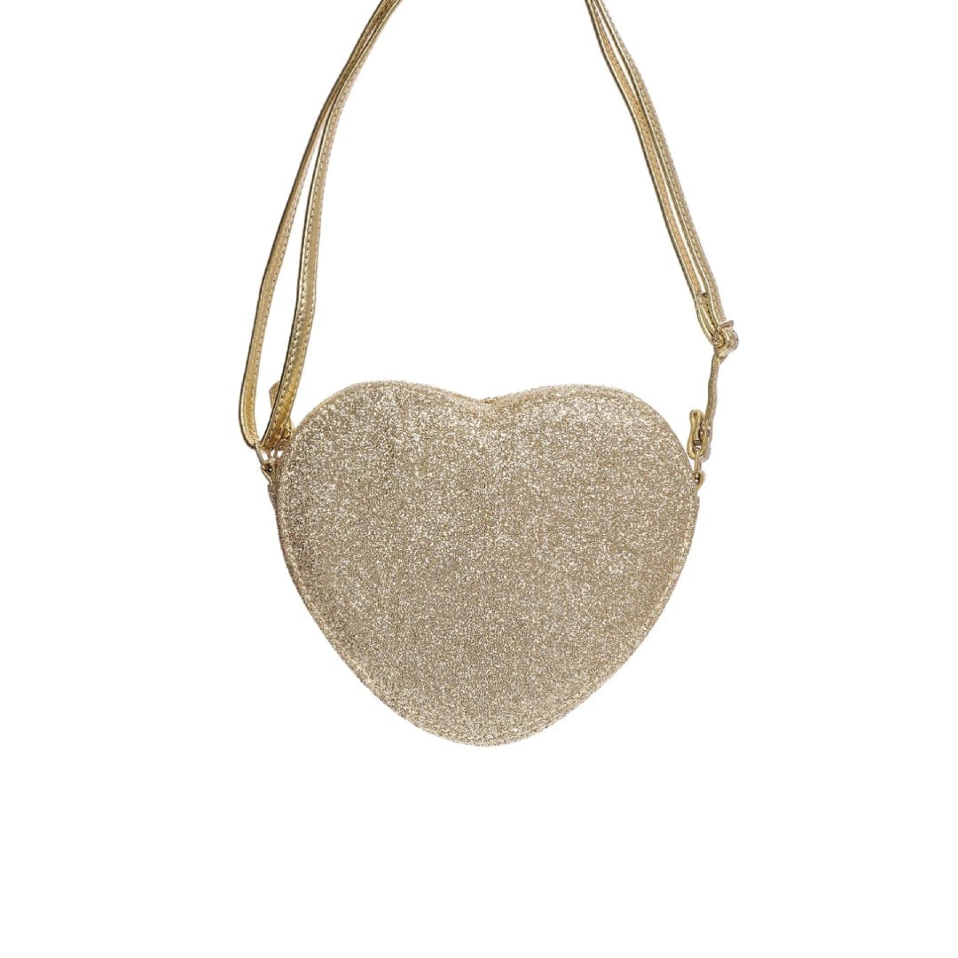 This love heart bag will make little hearts skip a beat! Made in gorgeous gold glitter and PU this bag is adorable in every way! Featuring a zip closure, a gold spotty lining and an adjustable gold PU strap with a break point for safety. The perfect party accessory!