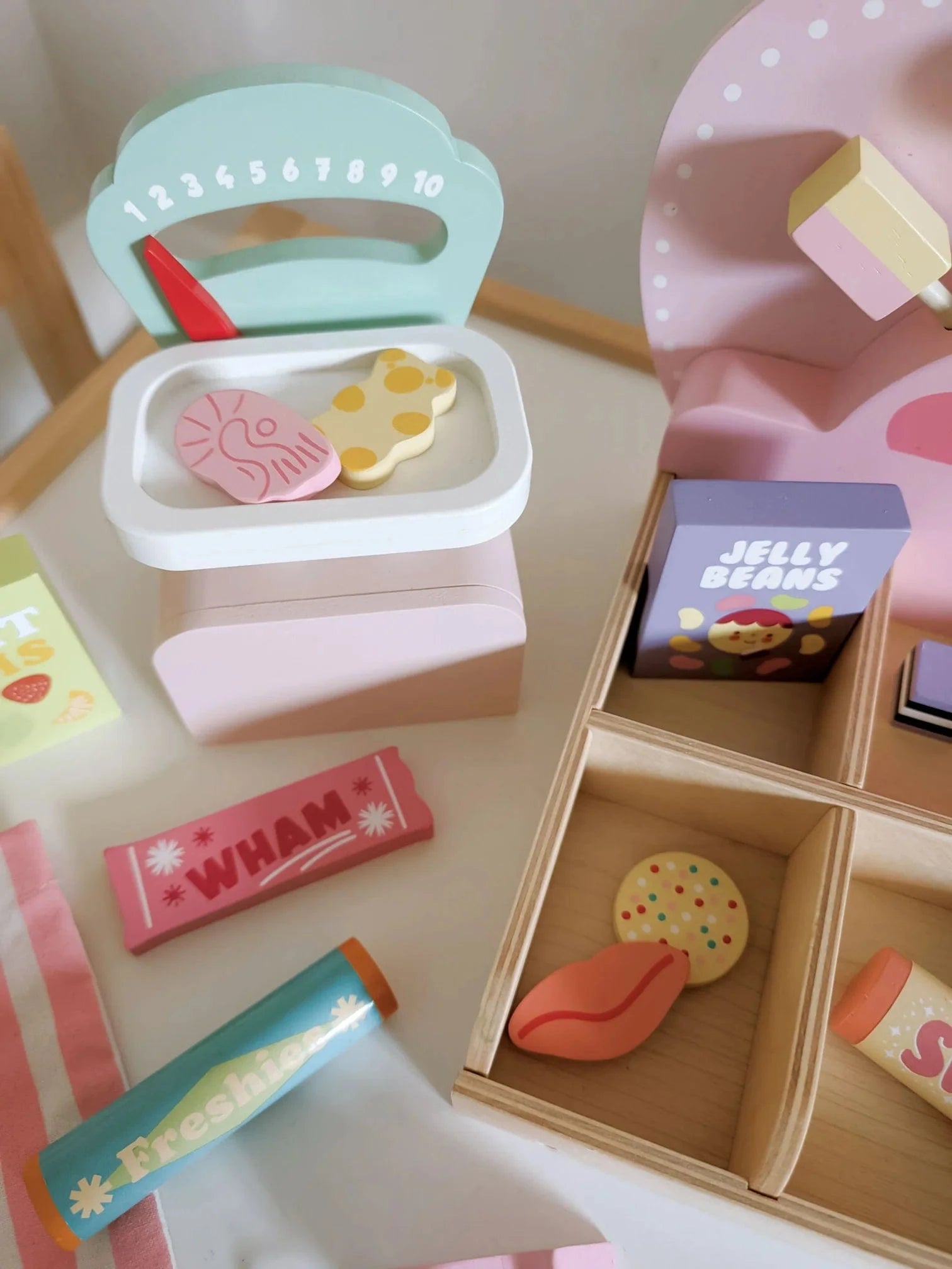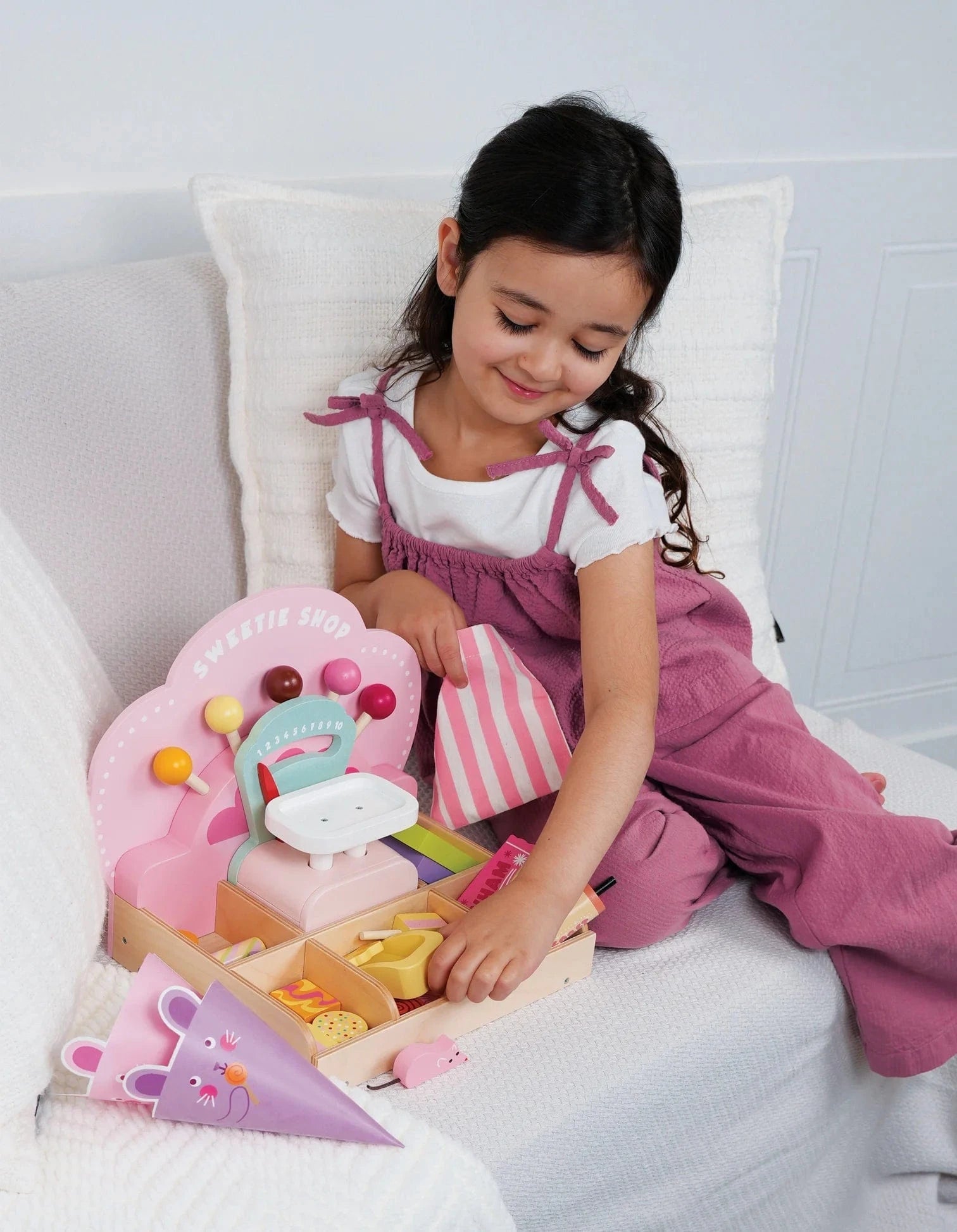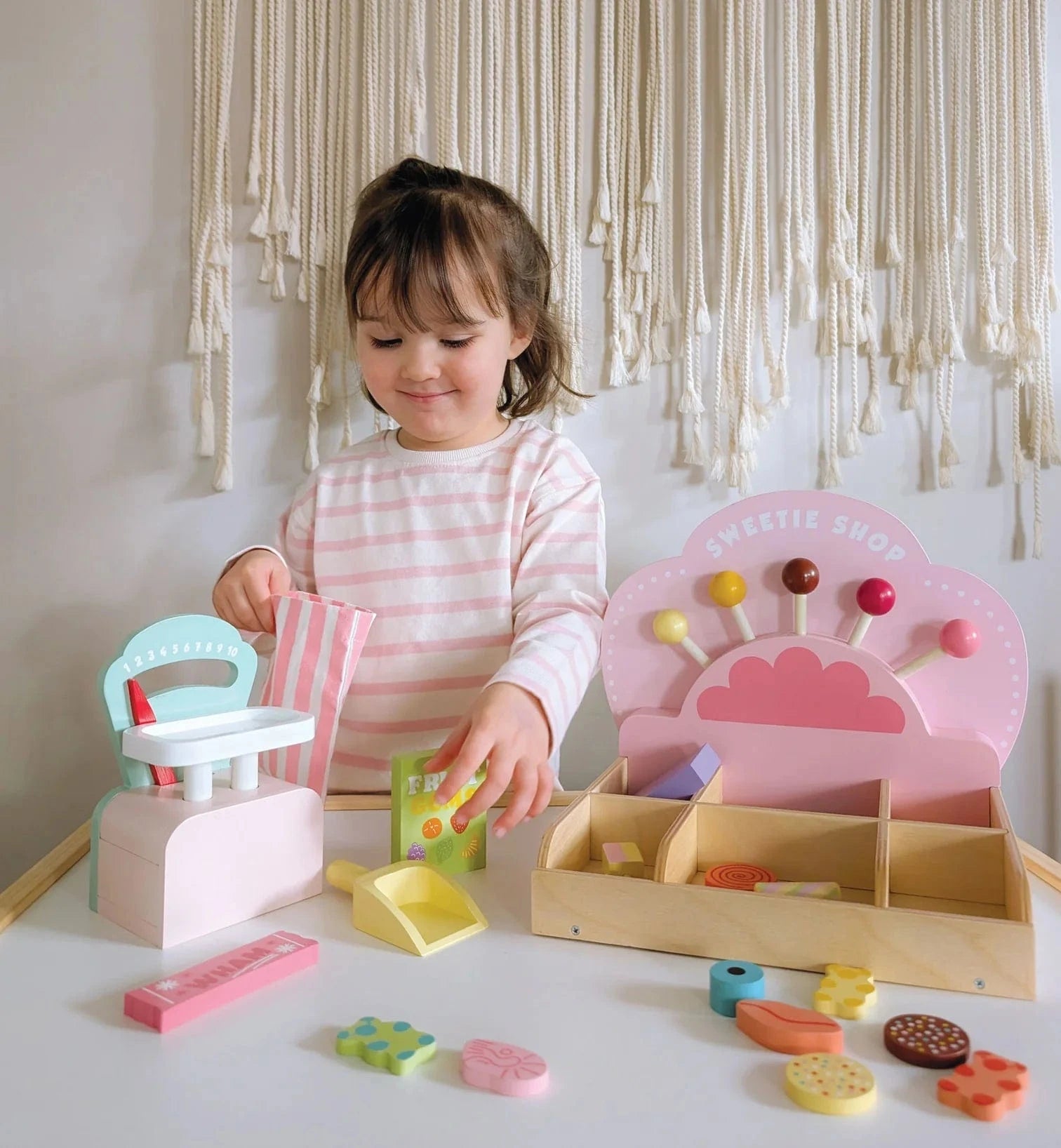 Become a sweet shop owner and welcome customers into your delightful retro-style sweetie shop! Pic ‘n’ Mix candies, gummies, lollipops, penny chews, and chocolate bars arranged in compartments or along the decorative shelf. Select with the scoop, pop them on the weighing scale and present in the pink striped fabric bag for your happy customer.