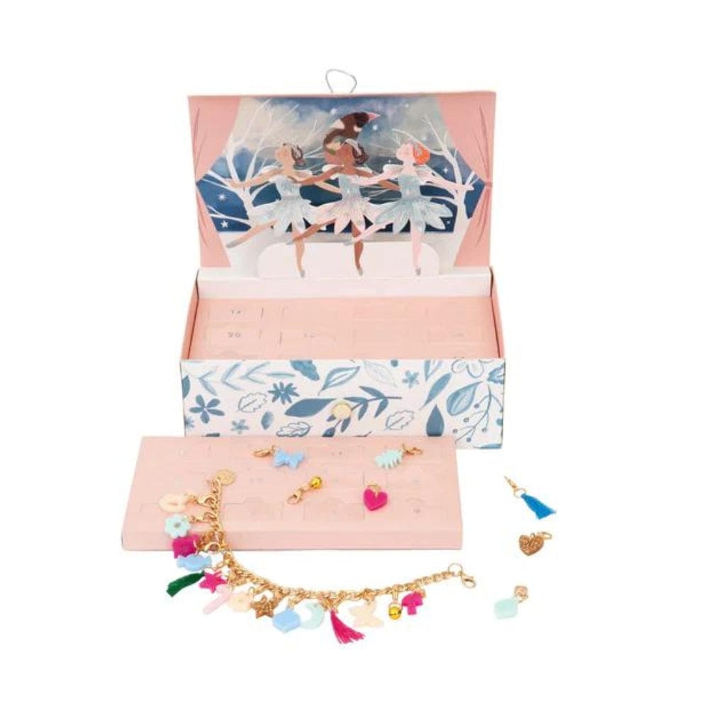 Beautiful ballerinas will adore this very special advent calendar suitcase. It opens to reveal a delightful design of 3 dancing ballerinas, and numbered trays. Open the trays each day to get a gold tone charm bracelet, and charms to place on it - to have a very special accessory to wear for Christmas day and beyond. The suitcase can then be used for years afterwards as a place to keep special items inside.The charms include acrylic shapes (butterflies, heart, star, moon, flowers and more), colorful tassels and bells.