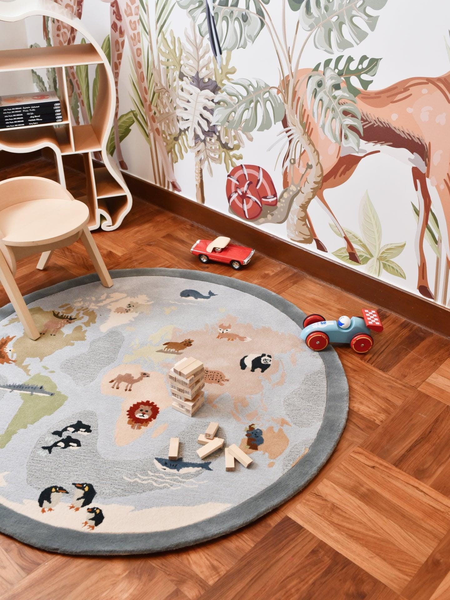 Discover the world with this adorable world map rug developed in-house by Bimbo Concept! Ask your little one to find the home of Panda, Lions, Tigers, Camels...!