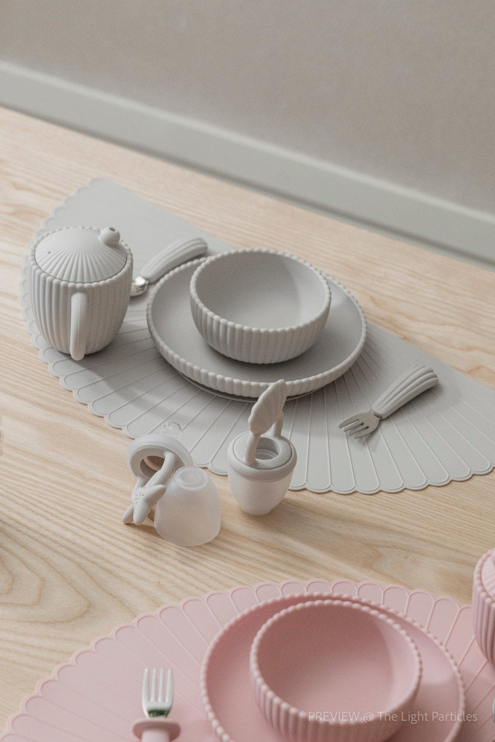 This Seashell Mealtime Premium Set is perfect for kids learning to feed themselves, combines functionality with safety for enjoyable, stress-free mealtime on the go! Made of 100% food-grade silicone and stainless steel, completely free of harmful chemicals.