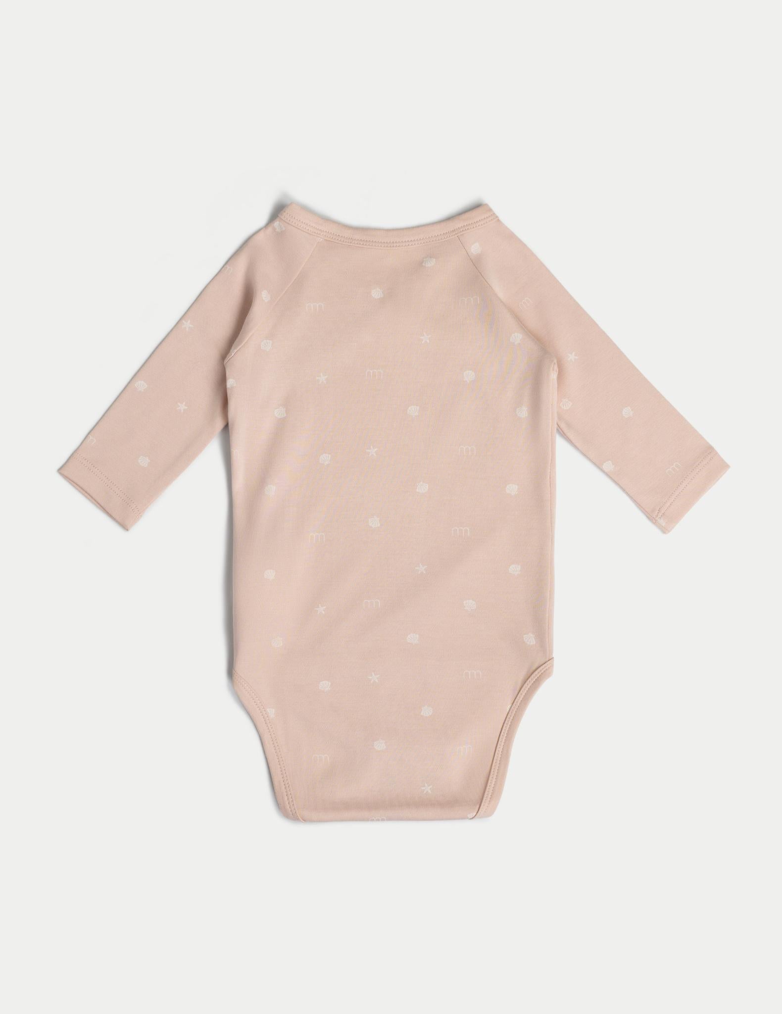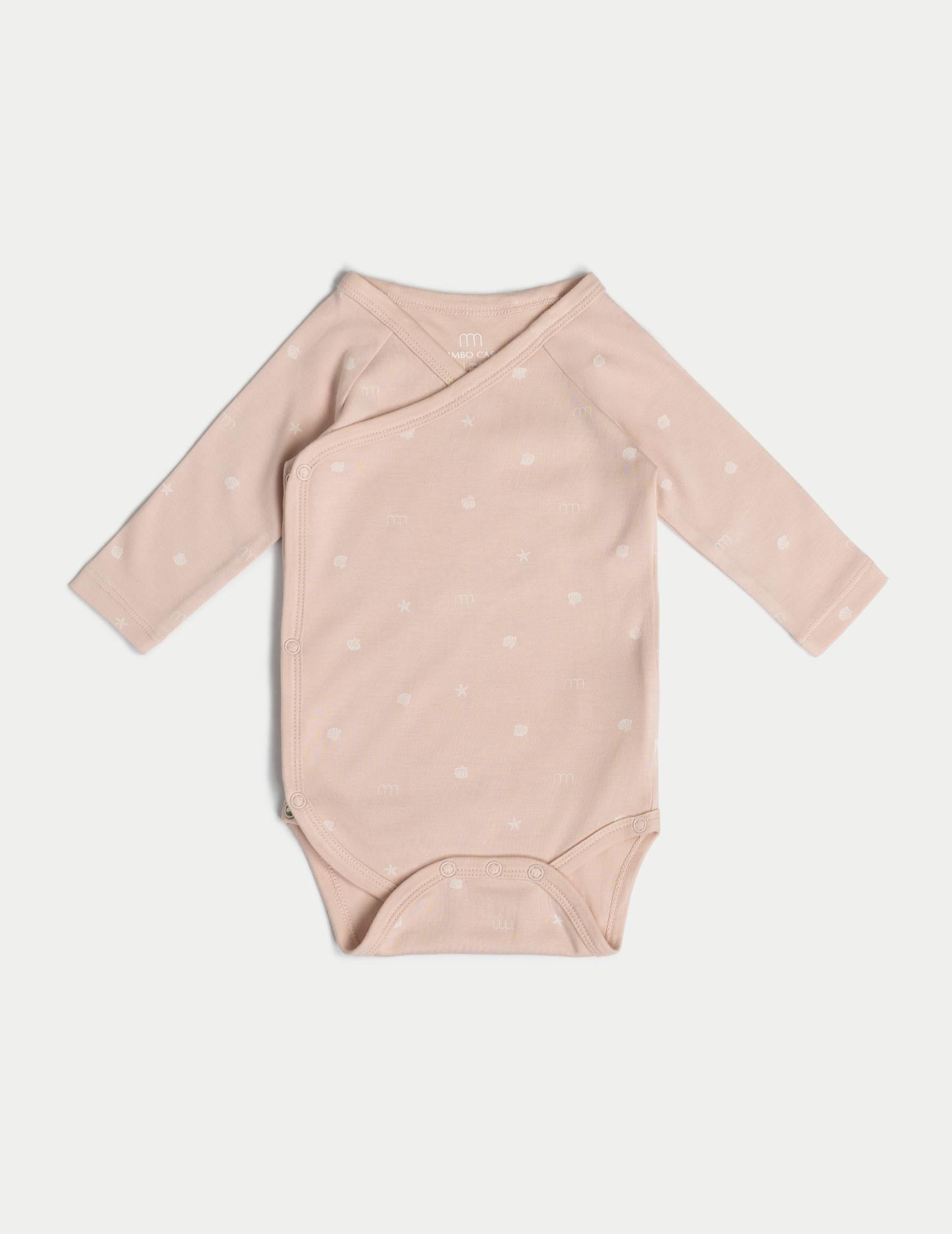 The fabric is eco-friendly, hypoallergenic, and naturally moisture-wicking, ensuring comfort in all seasons. Adorned with a charming seashell print, inspired by the serene beauty of coastal shores, this onesie features delicate patterns in soft earth tones of peach, mauve, and beige, evoking a dreamy, ocean-inspired aesthetic.