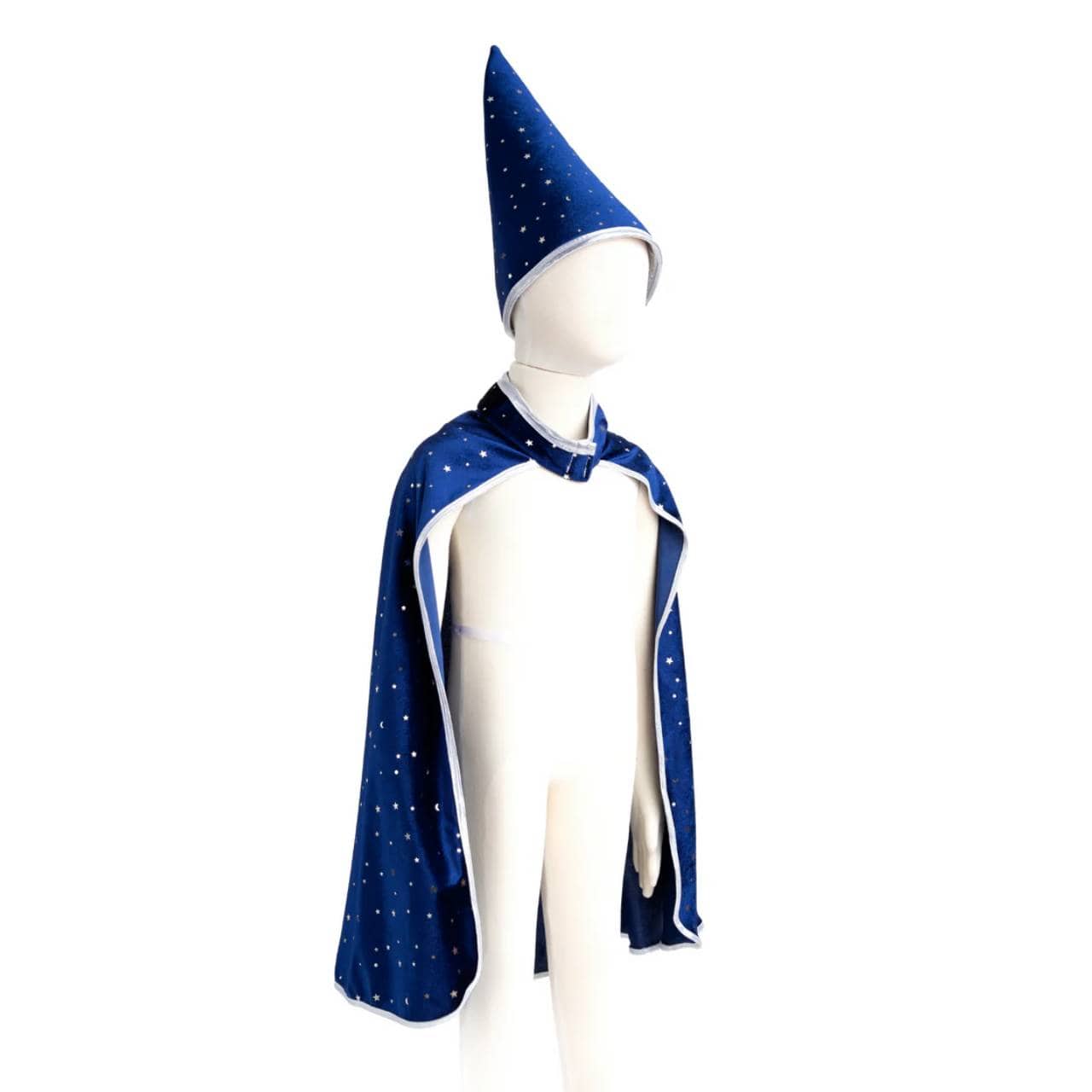 Merlin's Beard! The ultimate magician wizard set! Featuring silver glitter printed stars and moons on a deep midnight blue velour. This 2 piece set includes a pointed wizard hat with elastic chin strap & cape for a full and magical look. Proudly made in Canada this cape has a Velcro closure for easy on and off.