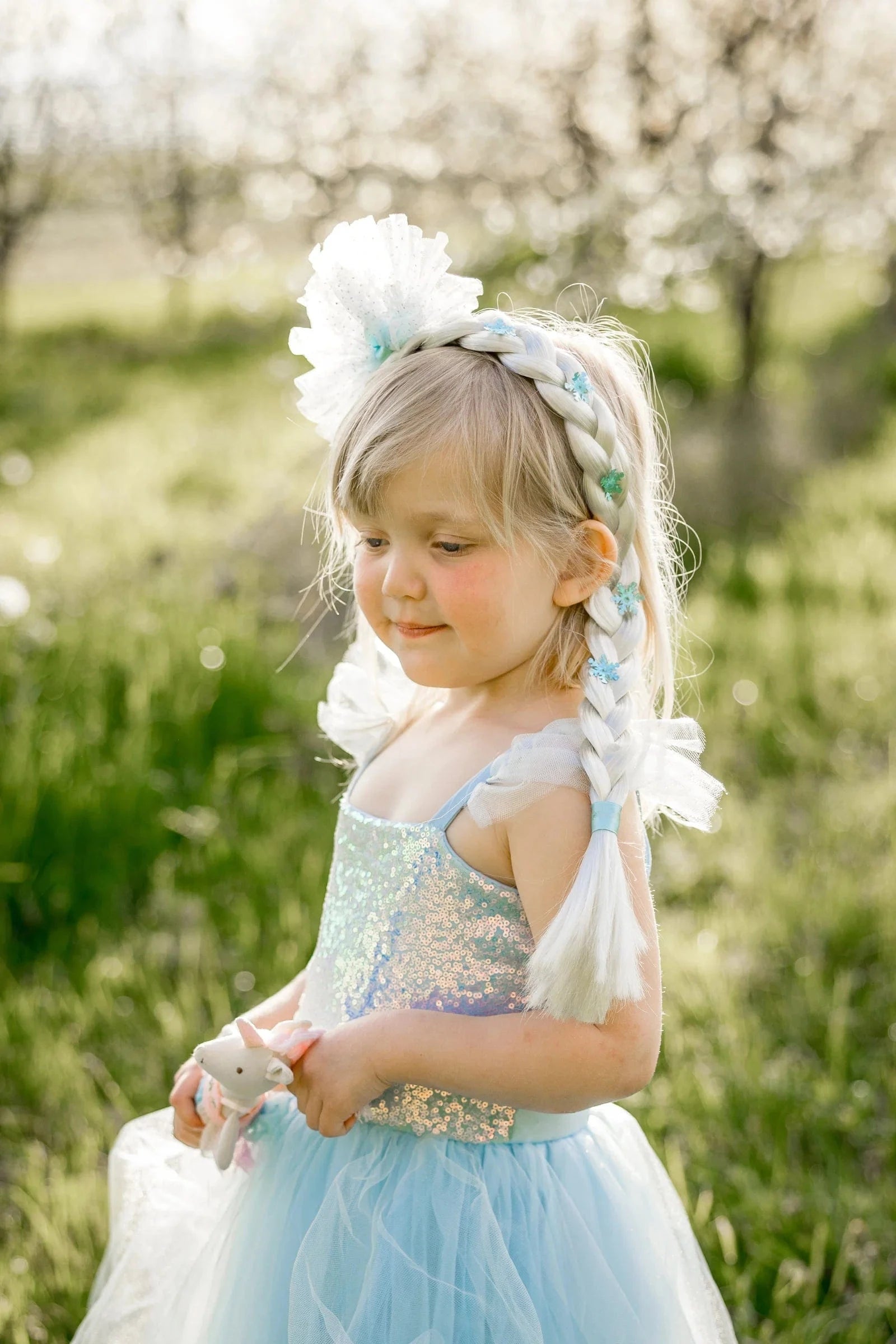 Our Ice Queen Princess Hair Braid features a delicate arrangement of glistening snowflakes that cascade down the blond hair braid like a magical frozen waterfall. The luminous icy hues of blonde & blue, evoke a sense of enchantment, adding an ethereal touch to any look.